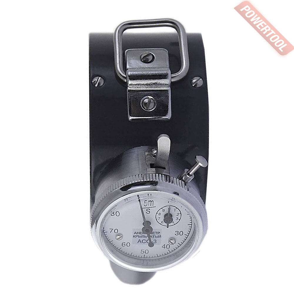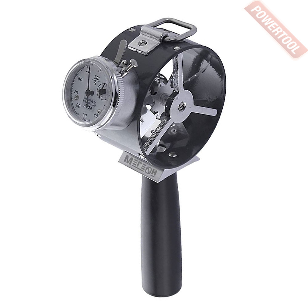 Термоанемометр механический крыльчатый, диапазон измерений скорости 0,3-5 м/с, погрешность 5 процентов плюс 0,1 м/с, чувствительность не менее 0,2 м/с, арретир, кнопка сброса, секундомер, возможность установки на удлинительную штангу, вес 0,23 кг, сумка для переноски.