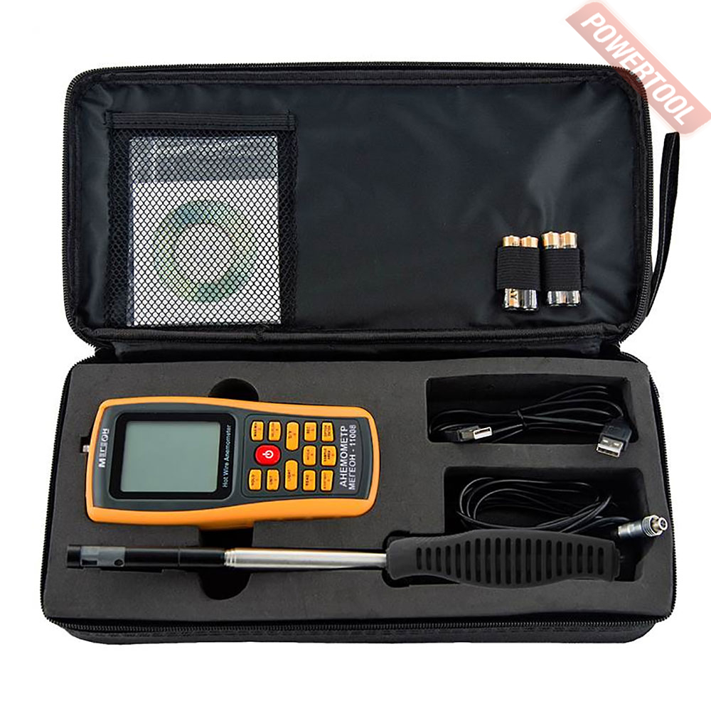 Термоанемометр с обогреваемой струной, диапазон измерений скорости 0-30 м/с, погрешность 3 процента плюс 0,1, разрешение 0,001 м/с, диапазон измерений температуры от 0 до 45 градусов С, диапазон измерения величины воздушного потока 0-999900 куб.м/мин, индикация минимальных, максимальных и средних значений, функция удержания данных HOLD, настройка конфигурации воздуховода, память 500 измерений, USB-интерфейс, ПО для обработки результатов, выбор единиц измерения СИ/USCS, питание от 4 батарей типа ААА, время непрерывной работы 20 часов, звуковое оповещение при нажатии на клавиши, резьба под штатив, вес 0,084 кг, защитный чехол.