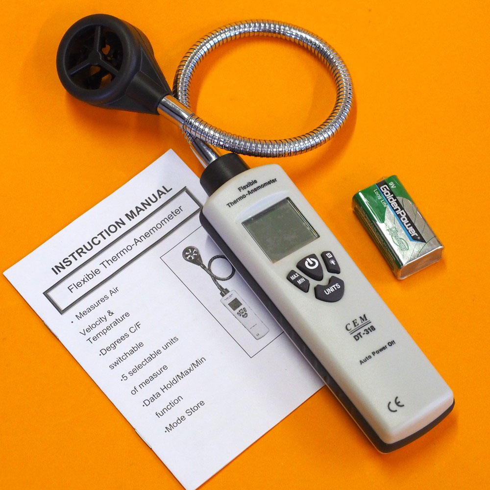 - 1. Анемометр с термодатчиком и гибким зондом CEM DT-318.