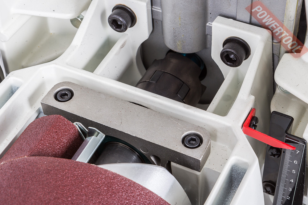 В штатном варианте поставки станок укомплектован алюминиевым барабаном с намоткой из абразивной ленты. Благодаря фирменной системе крепления её замена производится быстро и просто. Доступ к узлу освобождается после откидывания кожуха-пылесборника, концы фиксируются прижимами-защелками, натяжение производится специальным пружинным устройством, которое компенсирует вытягивание ленты в процессе износа.