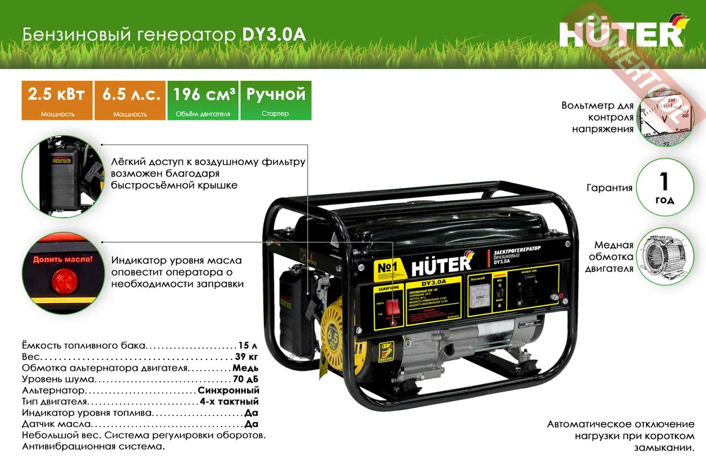 Бензиновый генератор HUTER DY3.0A - электрическая машина, предназначенная для автономного электроснабжения. В качестве первичного двигателя используется четырёхтактный карбюраторный двигатель, топливом для которого является неэтилированный бензин. Электрогенератор предназначен для получения электроэнергии в тех местах, где отсутствует магистральное электроснабжение. Это касается, как частных домов, где генераторы могут использоваться в качестве резервного источника питания, так и различных участков работ, где нужно электропитание для оборудования и проведения работ. Электрогенераторы HUTER много лет являются лидерами на российском рынке. Генераторы отличаются высоким качеством и надёжностью.