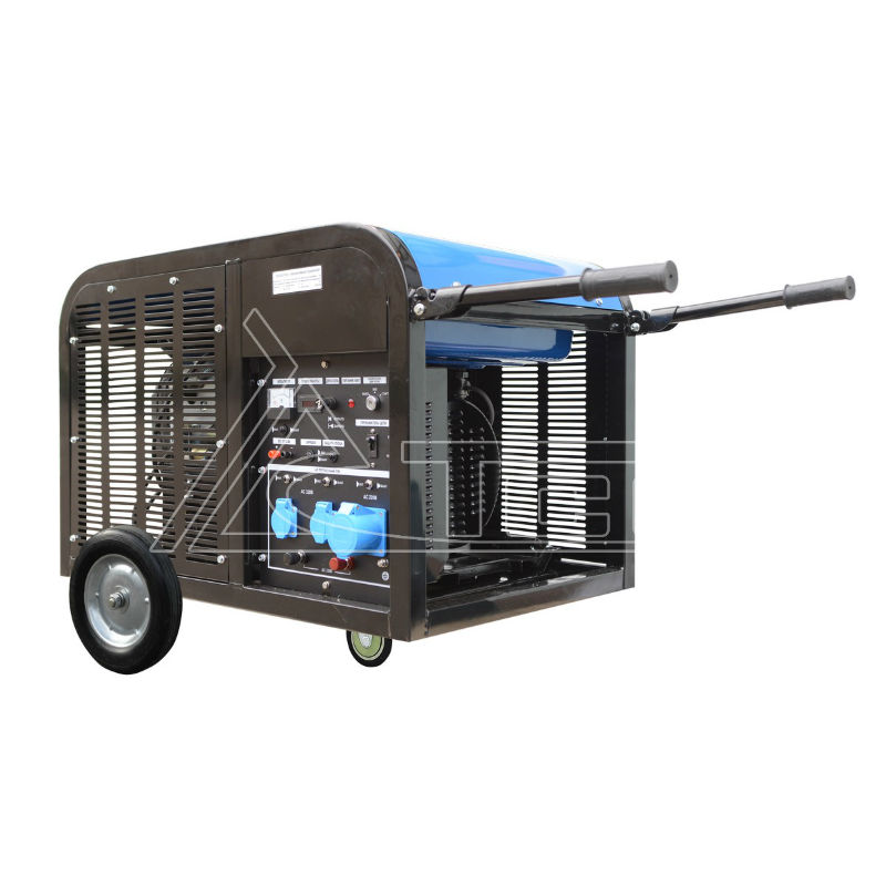 - Долговечный тележечный комплект с колесами и складными ручками облегчают перемещение генератора по рабочей площадке.