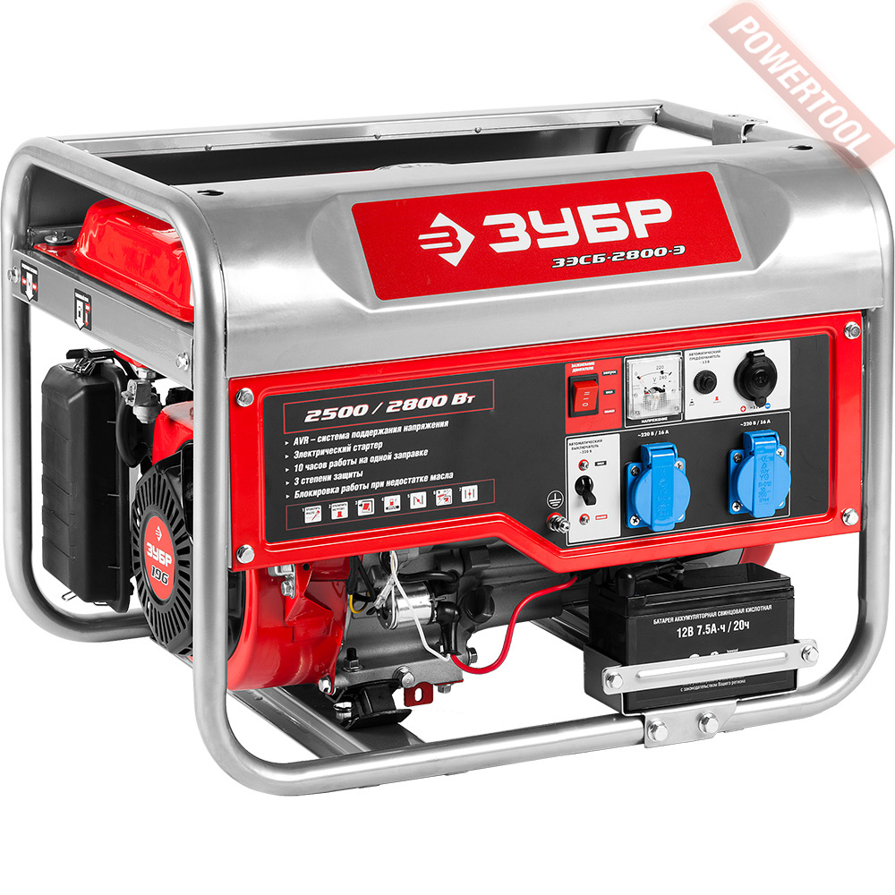 Бензиновый генератор ЗУБР ЗЭСБ-2800-Э - оптимальный по мощности генератор - может обеспечить практически любой потребитель в загородном доме во время перебоев с электроснабжением или служить дополнительным источником энергии при ограниченной мощности сети. Электрический стартер не только облегчает запуск (особенно в зимнее время), но и делает его даже приятным: раз - и готово. Высокий ресурс, низкое потребление топлива и повышенная надежность - основные достоинства генераторов ЗУБР.