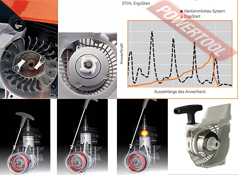 • Система облегченного запуска ErgoStart. Спиральная пружина между катушкой пускового тросика и коленвалом компенсирует пиковые усилия, теперь на тросике почти не ощущается толчков. Результат: STIHL ErgoStart по сравнению с традиционными пусковыми устройствами уменьшает усилие наполовину, а скорость запуска - примерно на две трети