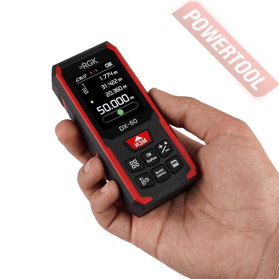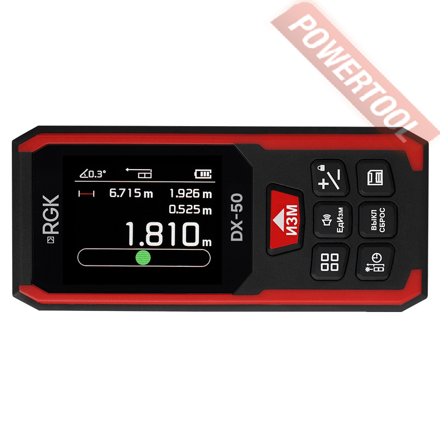 Дальномер лазерный RGK DX-50 представляет собой портативный комбинированный инструмент, поддерживающий 10 рабочих режимов, который может применяться для измерения расстояний и разметочных работ в диапазоне до 50 м, расчета площадей, объемов и недоступных размеров, а также для выравнивания и определения уклонов. По сравнению с рулетками семейства RGK DL, которые также оборудуются внутренним инклинометром, данное изделие обладает расширенной функциональностью и улучшенной наглядностью – за счет использования графического дисплея.