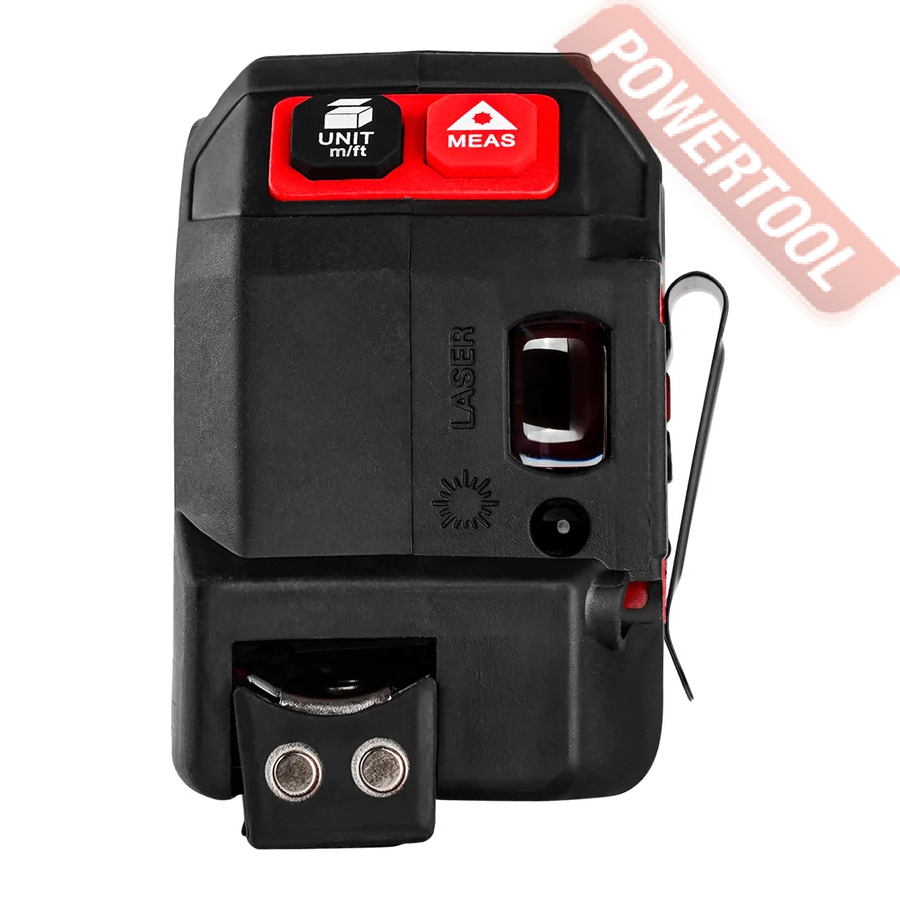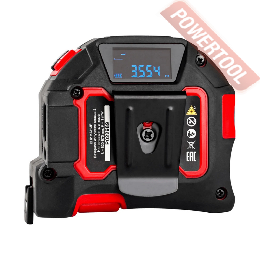 В основе устройства лежит первоклассная строительная рулетка со всем функционалом, который вы ожидаете от такого инструмента. Защищенный прорезиненный корпус не боится падений и ударов, измерительная лента со специальным покрытием служит долго, не выгорает и автоматически фиксируется при вытягивании, а скоба снабжена магнитами. Предусмотрена металлическая клипса для переноски прибора на поясе.