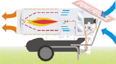 Дизельная тепловая пушка прямого нагрева MASTER B 360 может применяться на открытых или хорошо проветриваемых объектах, например, на строительных площадках, заводах, в складских помещениях. Предназначена для высокопроизводительного обогрева нежилых помещений, прогрева бетона или грунта при строительных и ремонтных работах. За короткое время может, обеспечить теплом большое пространство. Открытая камера сгорания выбрасывает вредные продукты вместе с горячим воздухом, поэтому применять в закрытых помещениях с людьми её нельзя. Перемещение и ввод в эксплуатацию не требует особых усилий и знаний. Запуск осуществляется нажатием одной кнопки, после продува системы происходит поджиг и дизельное топливо начинает равномерно сгорать в камере, а вентилятор создает воздушный поток и выдувает теплые массы в окружающее пространство. Уже на первой минуте работы жидкотопливного нагревателя, ощущается высокий КПД системы. Установка этой машины должна происходить в помещениях с возможностью проветривания, давая тем самым выход продуктам сгорания. Так как в технологии изготовления применен процесс прямого нагрева, то вместе с прогретым воздухом из сопла выходят элементы горения. Если нагнетательное давление сбалансировано и форсунка настроена правильно, то выхлопов минимальное количество, копать и темный дым отсутствуют. Каждая машина для обогрева от Master детально продуманна. Начиная от эргономических преимуществ, заканчивая внутренней технологичностью.
