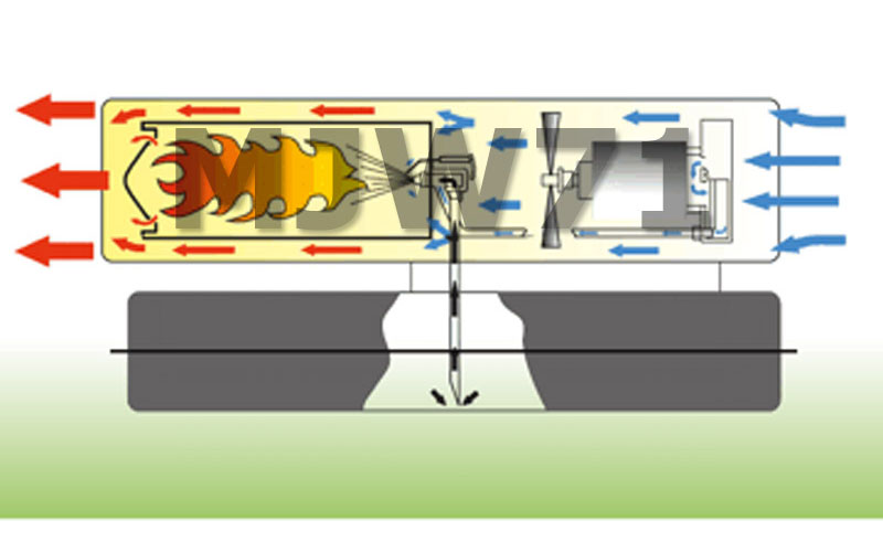 - Камера сгорания из нержавеющей стали. Форсунка распыляет дизель и он полностью сгорает в камере из нержавеющей стали. Во избежание эффекта копоти и дыма, рекомендуется своевременно обслуживать тепловую пушку, соблюдать правильные настройки подачи воздуха.