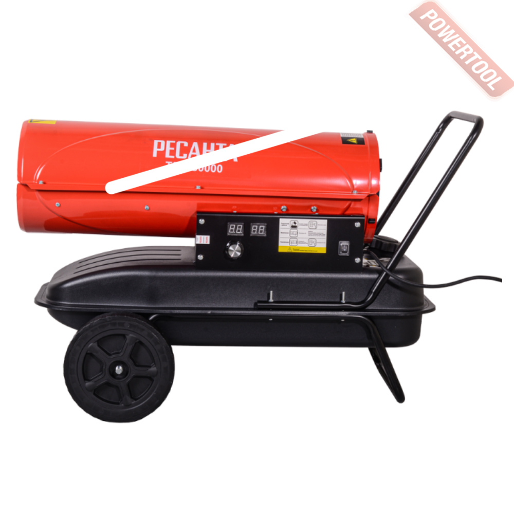 Дизельная тепловая пушка прямого нагрева РЕСАНТА ТДП-30000 может применяться на открытых или хорошо проветриваемых объектах, например, на строительных площадках, заводах, в складских помещениях. Предназначена для высокопроизводительного обогрева нежилых помещений, прогрева бетона или грунта при строительных и ремонтных работах. За короткое время может, обеспечить теплом большое пространство. Открытая камера сгорания выбрасывает вредные продукты вместе с горячим воздухом, поэтому применять в закрытых помещениях с людьми её нельзя. Перемещение и ввод в эксплуатацию не требует особых усилий и знаний. Запуск осуществляется нажатием одной кнопки, после продува системы происходит поджиг и дизельное топливо начинает равномерно сгорать в камере, а вентилятор создает воздушный поток и выдувает теплые массы в окружающее пространство. Уже на первой минуте работы жидкотопливного нагревателя, ощущается высокий КПД системы. Установка этой машины должна происходить в помещениях с возможностью проветривания, давая тем самым выход продуктам сгорания. Так как в технологии изготовления применен процесс прямого нагрева, то вместе с прогретым воздухом из сопла выходят элементы горения. Если нагнетательное давление сбалансировано и форсунка настроена правильно, то выхлопов минимальное количество, копать и темный дым отсутствуют.