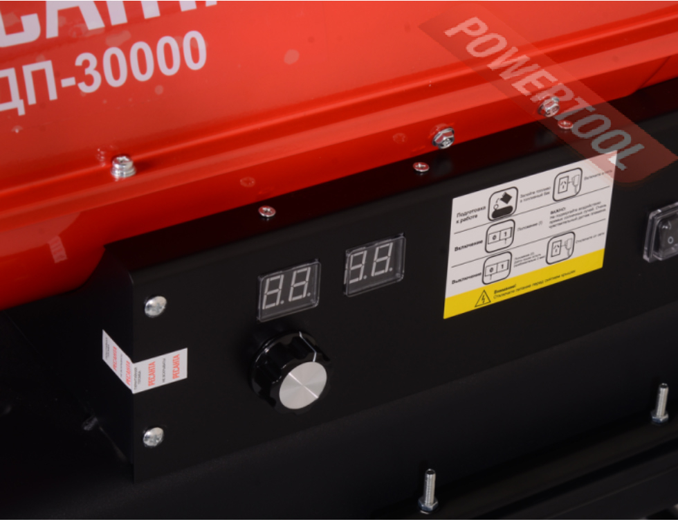 - Тепловая пушка снабжена встроенным термостатом. Термостат автоматически поддерживает заданную температуру воздуха в помещении, автоматически отключая и включая тепловую пушку. Для установки температурного режима есть отдельный переключатель. Рядом с переключателем находится цифровой дисплей, на котором отображается рабочая температура.