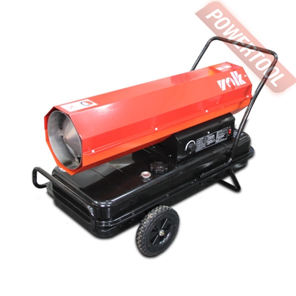 Дизельная тепловая пушка прямого нагрева VOLK DH 180 может применяться на открытых или хорошо проветриваемых объектах, например, на строительных площадках, заводах, в складских помещениях. Предназначена для высокопроизводительного обогрева нежилых помещений, прогрева бетона или грунта при строительных и ремонтных работах. За короткое время может, обеспечить теплом большое пространство. Открытая камера сгорания выбрасывает вредные продукты вместе с горячим воздухом, поэтому применять в закрытых помещениях с людьми её нельзя. Перемещение и ввод в эксплуатацию не требует особых усилий и знаний. Запуск осуществляется нажатием одной кнопки, после продува системы происходит поджиг и дизельное топливо начинает равномерно сгорать в камере, а вентилятор создает воздушный поток и выдувает теплые массы в окружающее пространство. Уже на первой минуте работы жидкотопливного нагревателя, ощущается высокий КПД системы. Установка этой машины должна происходить в помещениях с возможностью проветривания, давая тем самым выход продуктам сгорания. Так как в технологии изготовления применен процесс прямого нагрева, то вместе с прогретым воздухом из сопла выходят элементы горения. Если нагнетательное давление сбалансировано и форсунка настроена правильно, то выхлопов минимальное количество, копать и темный дым отсутствуют.