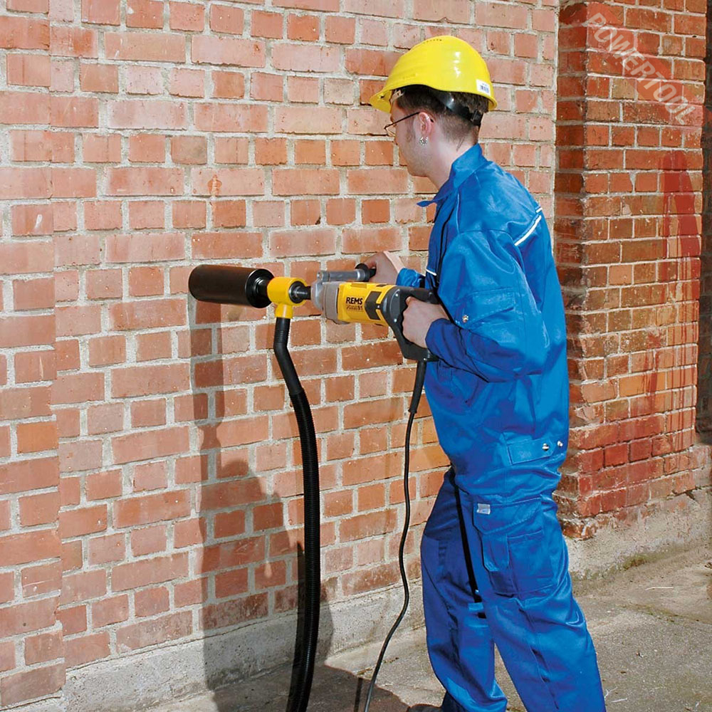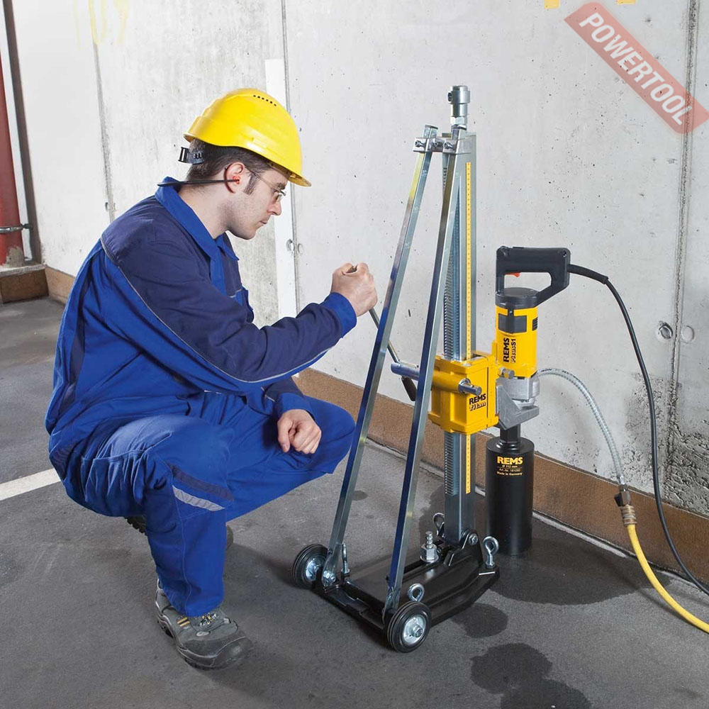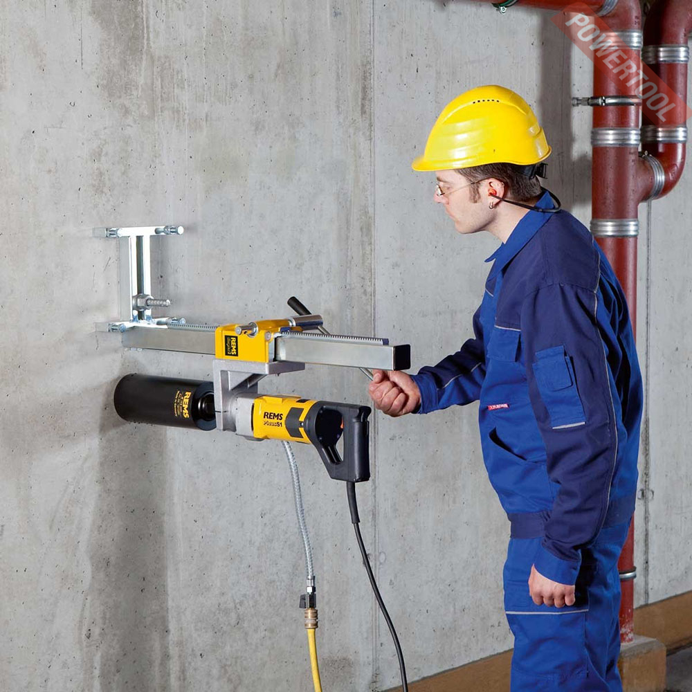 Дрель алмазного бурения REMS Picus S1 Basic-Pack для кольцевого сверления отверстий в бетоне, железобетоне до D 102 (132) мм, в кирпичной кладке и другом до D 162 мм. Для сухого/мокрого сверления на весу или на стойке. Приводной инструмент с коронками для кольцевого сверления с соединительной резьбой UNC 1 1/4 наружной, G 1/2 внутренняя, редуктор не требующий технического обслуживания, с проскальзывающей муфтой безопасности. Универсальный двигатель 220 В, 50–60 Гц, 1850 Вт. Мультифункционная электроника с мягким пуском, ограничением числа оборотов на холостом ходу с защитой от перегрузок. Толчковый переключатель с фиксатором. PRCD – выключатель. Число оборотов сверлильного шпинделя 580 об/мин.