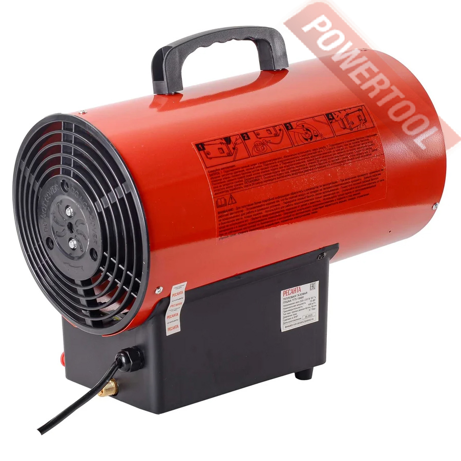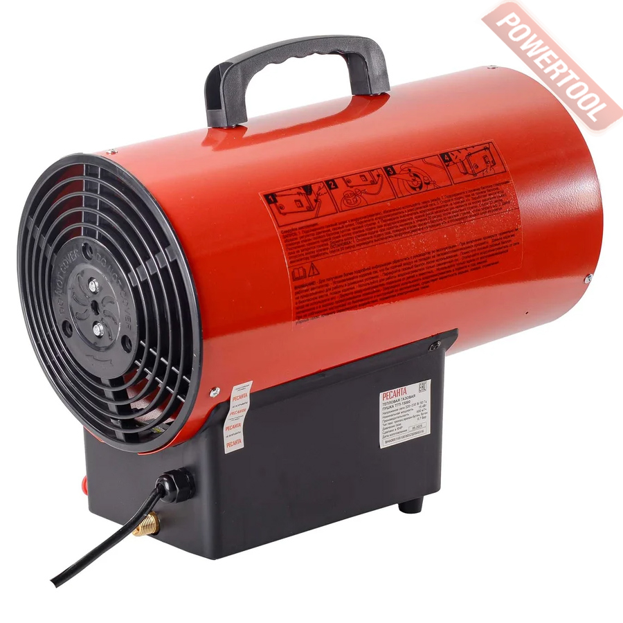 Газовая тепловая пушка РЕСАНТА ТГП-15000 - переносной обогреватель воздуха, работающий на газе, он быстро и эффективно обогревает большие площади. Это оборудование не требует больших затрат и капиталовложений. Газовые нагреватели воздуха широко применяются в помещениях с хорошей вентиляцией: на строительных площадках, заводах и в складских помещениях. Характерные особенности это полное использование топлива, а также обмен тепла благодаря непосредственному смешиванию входящего воздуха с продуктами сгорания. Что касается топлива, то для этих целей подходит баллон с пропаном или бутаном. Соответствующий шланг присоединяется через редуктор к вентилю баллона. Необходимо соблюдать все правила работы с газовыми баллонами. Также необходимо помнить, что процесс горения активно поглощает кислород, который жизненно необходим человеку. Поэтому помещения, где устанавливаются тепловые пушки, должны постоянно проветриваться и иметь хорошую вентиляцию. Для правильной работы обогреватель требует соответствующего количества свежего воздуха. Поэтому он предназначен для использования вне помещений или в помещениях с хорошей вентиляцией, где обеспечено соответствующее количество воздуха. Соответствующую вентиляцию можно обеспечить, приспосабливая обогревательную мощность прибора к площади помещения в соответствии со следующей пропорцией: 1 куб.м на каждые 100 Вт мощности. Ни в коем случае не рекомендуется, чтобы помещение было меньше, чем 100 куб.м. Соответствующий обмен воздуха может быть обеспечен благодаря вентиляционному отверстию, соответствующему следующим требованиям: величина 25 кв.см на 1 кВт обогревательной (минимум 250 кв.см) мощности, размещение точно между верхней и нижней частью помещения.