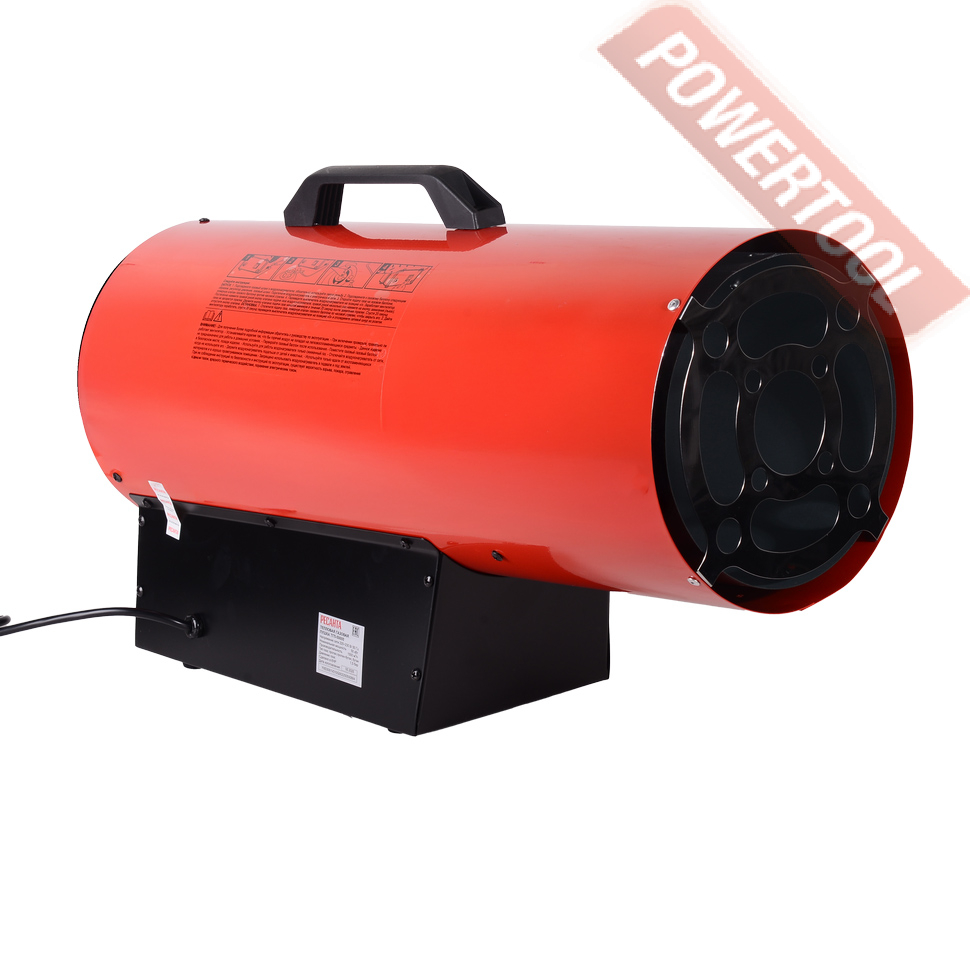 Газовая тепловая пушка РЕСАНТА ТГП-50000 - переносной обогреватель воздуха, работающий на газе, он быстро и эффективно обогревает большие площади. Это оборудование не требует больших затрат и капиталовложений. Газовые нагреватели воздуха широко применяются в помещениях с хорошей вентиляцией: на строительных площадках, заводах и в складских помещениях. Характерные особенности это полное использование топлива, а также обмен тепла благодаря непосредственному смешиванию входящего воздуха с продуктами сгорания. Что касается топлива, то для этих целей подходит баллон с пропаном или бутаном. Соответствующий шланг присоединяется через редуктор к вентилю баллона. Необходимо соблюдать все правила работы с газовыми баллонами. Также необходимо помнить, что процесс горения активно поглощает кислород, который жизненно необходим человеку. Поэтому помещения, где устанавливаются тепловые пушки, должны постоянно проветриваться и иметь хорошую вентиляцию. Для правильной работы обогреватель требует соответствующего количества свежего воздуха. Поэтому он предназначен для использования вне помещений или в помещениях с хорошей вентиляцией, где обеспечено соответствующее количество воздуха. Соответствующую вентиляцию можно обеспечить, приспосабливая обогревательную мощность прибора к площади помещения в соответствии со следующей пропорцией: 1 куб.м на каждые 100 Вт мощности. Ни в коем случае не рекомендуется, чтобы помещение было меньше, чем 100 куб.м. Соответствующий обмен воздуха может быть обеспечен благодаря вентиляционному отверстию, соответствующему следующим требованиям: величина 25 кв.см на 1 кВт обогревательной (минимум 250 кв.см) мощности, размещение точно между верхней и нижней частью помещения.