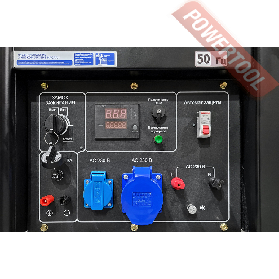 - Электронная система аварийной защиты (контролирует параметры работы станции и, при необходимости, выключит генератор, в том числе по перегрузке или по низкому уровню масла).