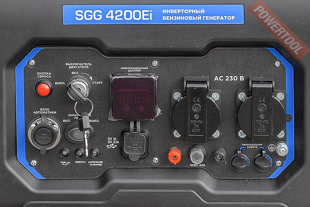 Генератор инверторный ТСС TSS SGG 4200Ei с электростартом и разъемом для подключения блока автоматики, вырабатывает электричество с высокой точностью частоты и напряжения. Предназначен для подключения к нему потребителей общей максимальной мощностью до 4,2 кВт. Позволяет подключать к генератору как обычных потребителей, так и точное электронное оборудование, например, ноутбуки, LCD-телевизоры или смартфон. Благодаря использованию В этой модели инверторного преобразователя, на выходе получается стабильный ток, без каких-либо скачков, генератор способен регулировать работу двигателя в зависимости от нагрузки: к примеру, если нагрузка составляет половину от выходной мощности, то и мощность двигателя снижается вдвое; это дает значительную экономию топлива, инверторные модели получаются более легкими и компактными, чем традиционные генераторы.