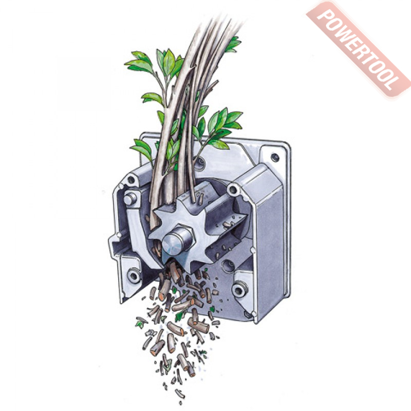 - Ножевой валик. Сердцем мощного и бесшумного измельчителя является особый вальцовый агрегат с прочным, медленно вращающимся ножевым валиком. Он тщательно и почти бесшумно измельчает ветки диаметром до 40 мм с частотой вращения всего 40 оборотов в минуту.