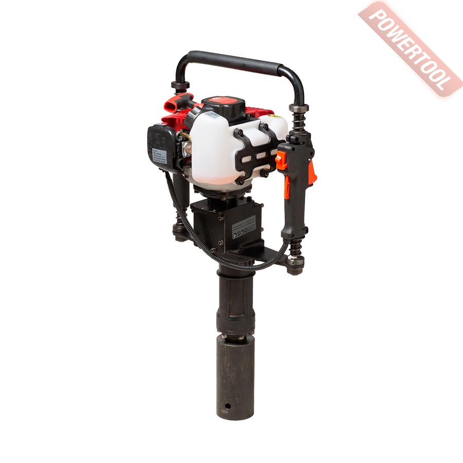 Бензиновый копер для забивки столбов, mах диаметр столбов 60 мм, энергия удара 45 Дж, 2-х тактный двигатель объемом 42,5 куб.см мощностью 1,6 л.с., 1700-2230 ударов/мин, смесь 25к1, объем топливного бака 1,2 л, расход 0,5 л/ч, размеры ДхШхВ 740х340х260 мм, вес 13 кг, две ударных чашки 60 мм, смазка, набор ключей.