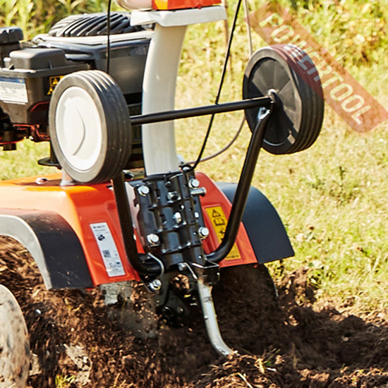 - Два колеса для транспортировки. Для плавного передвижения этот культиватор STIHL оснащен колесным мостом сзади. Во время измельчения колеса можно сложить.