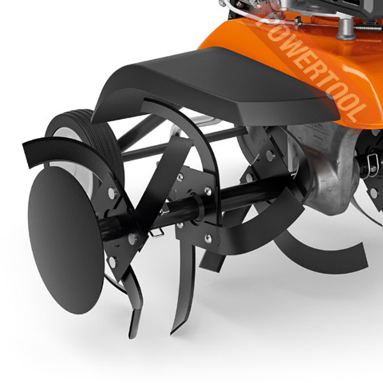 - Разборный комплект для вспашки. Во всех мотоблоках STIHL имеется разборный комплект для вспашки, с помощью которого можно уменьшать рабочую ширину и, соответственно, использовать орудие для более нежных культур. Боковые диски дополнительно защищают растения при вспашке.