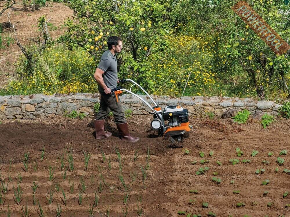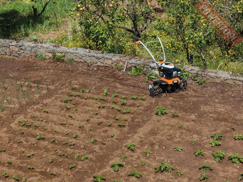 - Два колеса для транспортировки. Для плавного передвижения этот культиватор STIHL оснащен колесным мостом сзади. Во время измельчения колеса можно сложить.