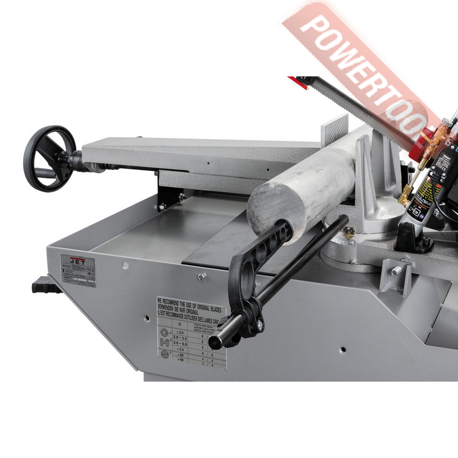 JET MBS-910 CSE оборудован быстрозажимными тисками, используя которые можно добиться высокой производительности работ. Консоль станка имеет направляющие, передвижение которых позволяет регулировать проход ленточного полотна, повысить качество распила и ограничить уводку полотна в сторону. Направляющие оснащены подшипниками выполняющими функцию позиционирования ленточного полотна в вертикальном положении относительно обрабатываемой заготовки. Станок имеет тензометр, фиксирующий силу натяжения ленточного полотна. Регулировка силы натяжения осуществляется вручную.