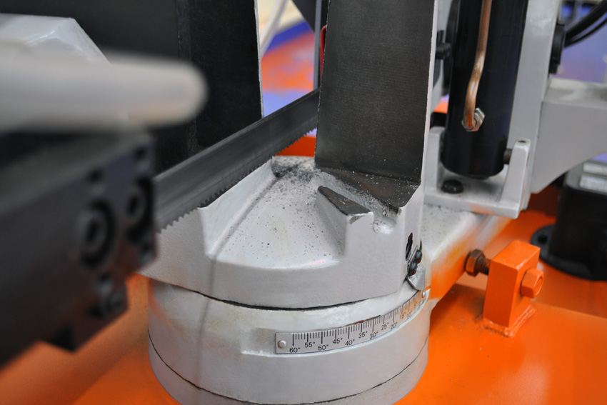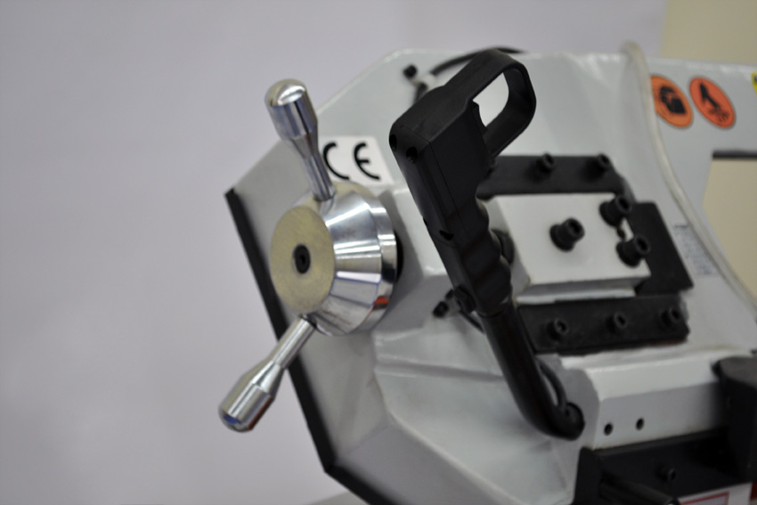 - Тиски. Используя данную модель имеющую быстрорегулируемые тиски для резки под углом, поворачивается рама, а не заготовка. Тиски с системой быстрого отвода ускоряют процесс смены заготовки (ускоренный отвод подвижной губки происходит без вращения маховика). Зажим заготовки осуществляется тисками вручную, подача заготовки - также вручную.