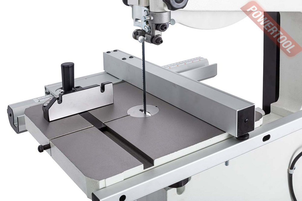 Параллельный упор с эксцентриковым фиксатором перемещается вдоль алюминиевого профиля, закреплённого возле переднего края стола. Для упрощения настройки предусмотрена миллиметровая шкала и увеличительное стекло с риской на корпусе. В качестве опции предлагается чугунная направляющая c двухпозиционным упором 150 мм, направляющий профиль которого в вертикальном положении позволяет надежно фиксировать высокие заготовки при их роспуске на тонкие пластины, в низком – плоские детали, а также для пиления с наклоном.