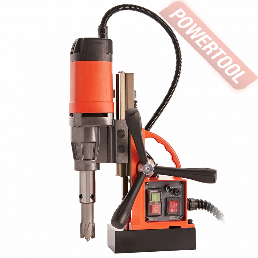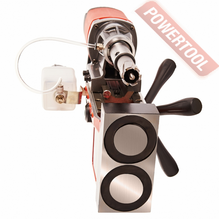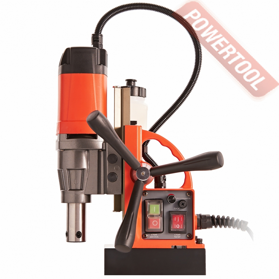 Вертикальное положение шпинделя при необходимости можно поднять вверх до 195 мм от основания магнита для установки дополнительной оснастки или опустить ниже магнитного основания на 23 мм, за счет дополнительного крепления привода на направляющей. Рекомендуем данный станок к использованию для высотных работ, на небольших производствах, в специализированных цехах металлообработки.