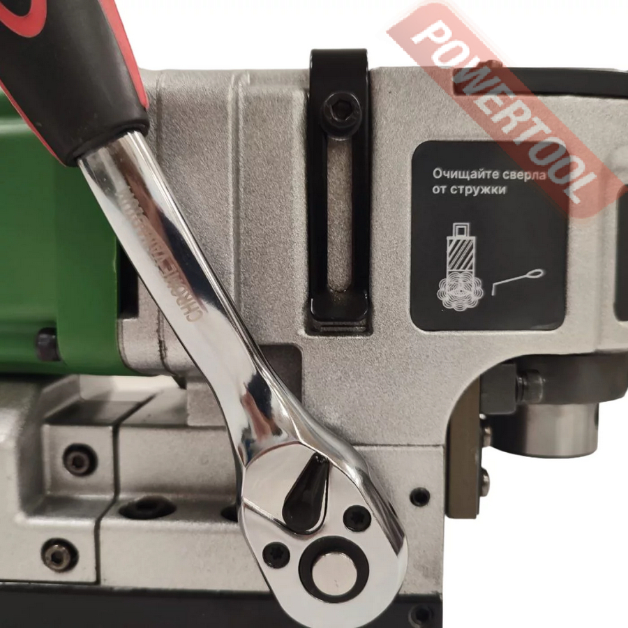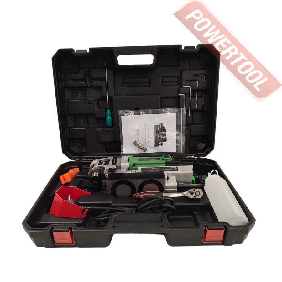 Магнитный сверлильный станок, 1300 Вт, 220 В, max диаметр корончатого сверла 50 мм, крепление корончатого сверла на Weldon 19, ход шпинделя 61 мм, частота вращения шпинделя 200-500 об/мин, 6 скоростей, прижимная сила 9000 Н, размер магнитного основания ДхШ 190х80 мм, вес 17 кг, регулировка оборотов, в комплекте емкость для СОЖ, ручка с трещёткой, комплект угольных щеток, страховочный ремень, сумка для хранения оснастки, кейс.
