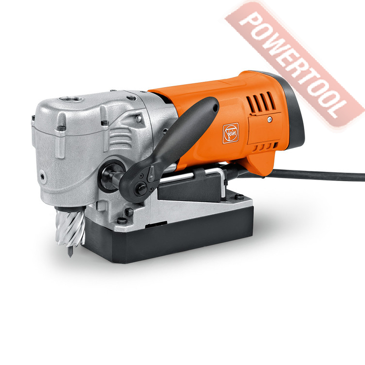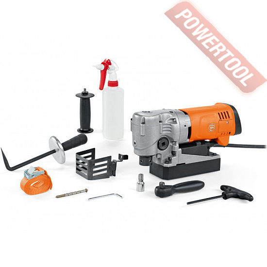 Магнитный сверлильный станок FEIN KBC 35 - односкоростной магнитный станок с угловым редуктором для сверления корончатым сверлом по металлу диаметром до 35 мм и спиральным до 16 мм. Хвостовик 3/4 Weldon (19 мм). Максимальный диаметр зенковки 32 мм. Нарезание резьбы до М12. Специально создан для работы в узких и труднодоступных местах. Монтажная высота станка всего 169 мм. Скорость вращения под нагрузкой 130-520 об/мин, с функцией запоминания частоты вращения. Электронный тахометр гарантирует стабильную частоту вращения в правом и левом направлении. Подача СОЖ в зону сверления с помощью ручного насоса. Величина хода каретки 46 мм. Прилагаемая трещотка позволяет управлять сверлением с двух сторон.