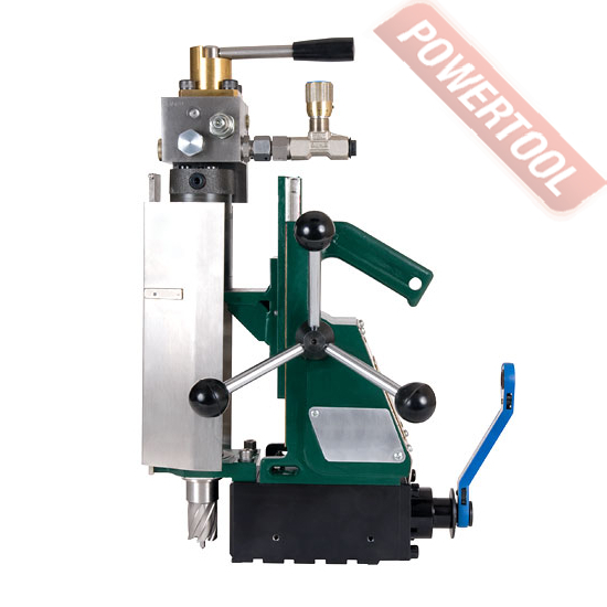 Магнитный сверлильный станок гидравлический, 1100 Вт, давление воздуха 140 бар, расход воздуха 20-25 л/мин, max диаметр корончатого сверла 52 мм, max диаметр спирального сверла 13 мм, крепление корончатого сверла на Weldon 19, ход шпинделя 80 мм, частота вращения шпинделя 630 об/мин, 1 скорость, прижимная сила 7000 Н, размер магнитного основания ДхШ 175х75 мм, габариты ДхШхВ 320х160х520 мм, вес 23 кг, в комплекте адаптер Weldon 19/B16, трехкулачковый патрон 1-13 мм, рукоятка подачи 3 шт, набор ключей, страховочная цепь, кейс.