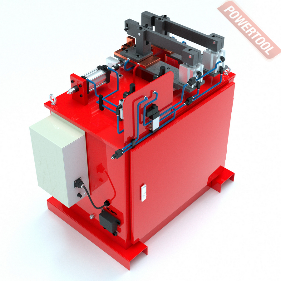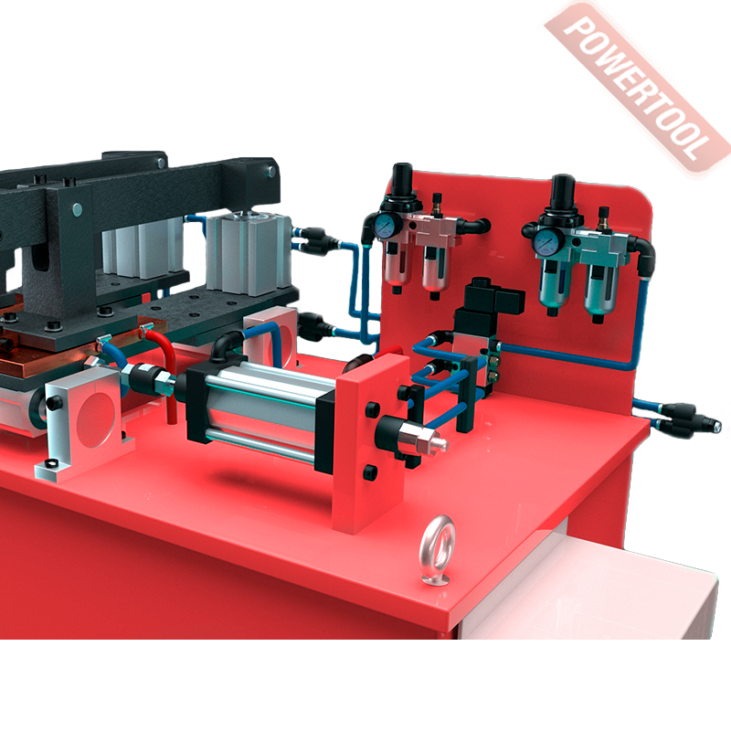 Машина функционирует на основе пневматического привода и оборудована электронным блоком с микропроцессором, который даёт возможность контролировать параметры сварки. Процесс сварки регулируется с помощью педали.