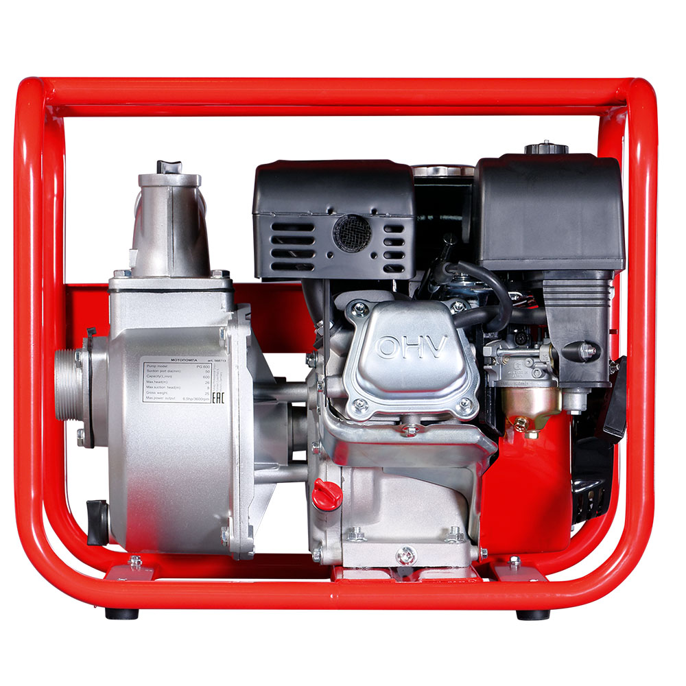 Мотопомпа бензиновая для чистой воды, max производительность 600 л/мин, max уровень подъема 26 м, max глубина всасывания 8 м, диаметр отверстий вход / выход G2 или 50 мм, max допустимый размер частиц 4 мм, 4-тактный бензиновый двигатель объемом 212 куб.см мощностью 7 л.с., объем топливного бака 3,6 л, размер (ДхШхВ) 485х375х430 мм, вес 21,4 кг, патрубки для шланга, хомуты и всасывающий фильтр.