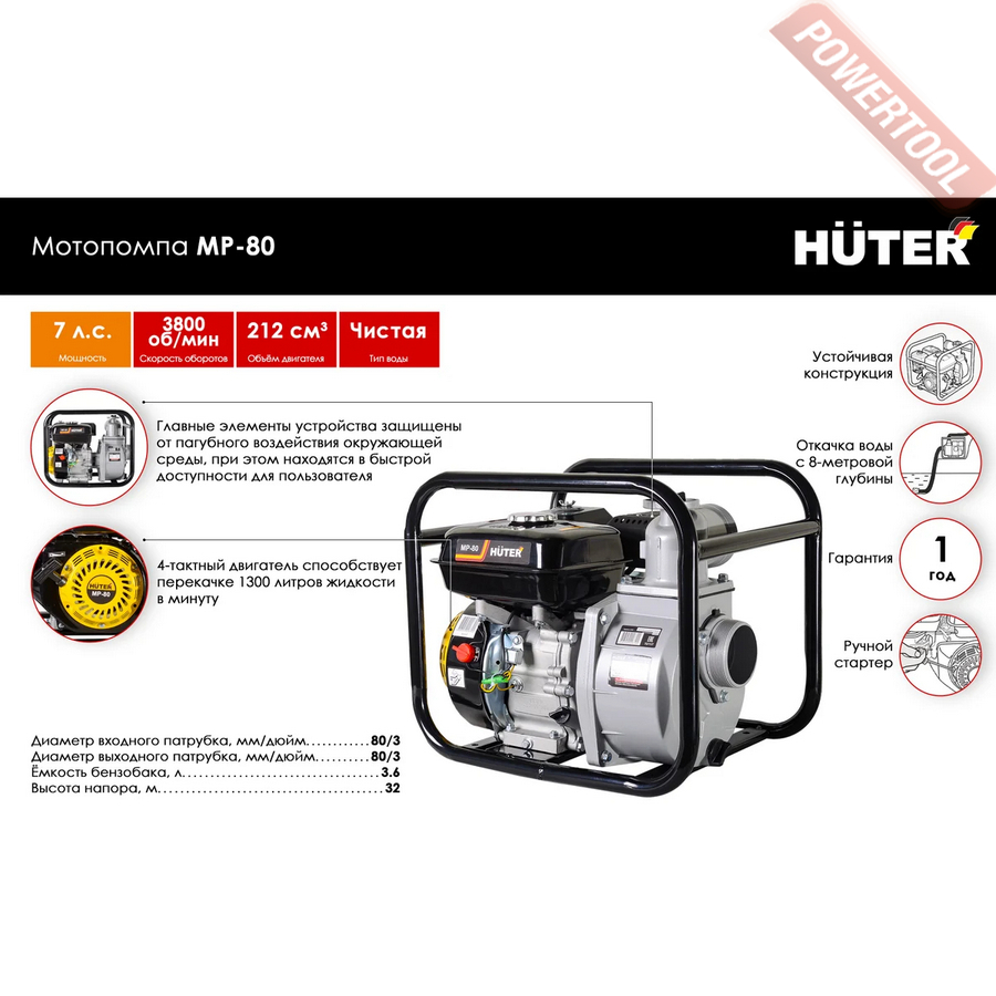 • 1. Мотопомпа бензиновая для чистой воды HUTER MP-80.