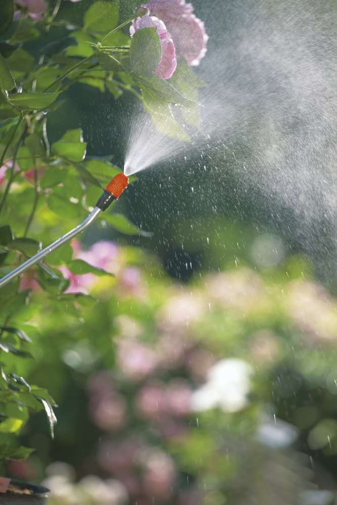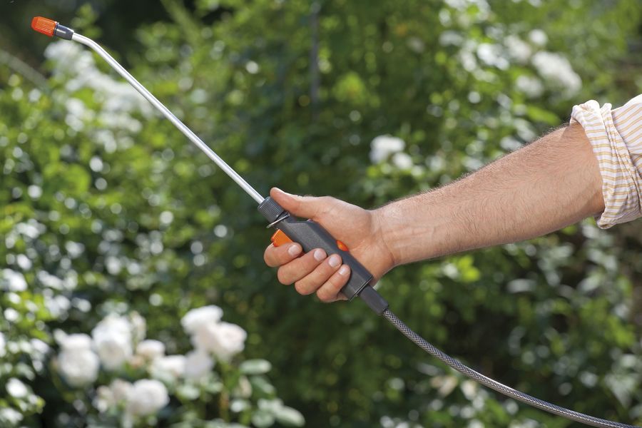 - Длинный шланг. Наличие длинного шланга позволяет легко поливать даже высокие растения, вне зависимости от места расположения опрыскивателя (на земле или на тележке).