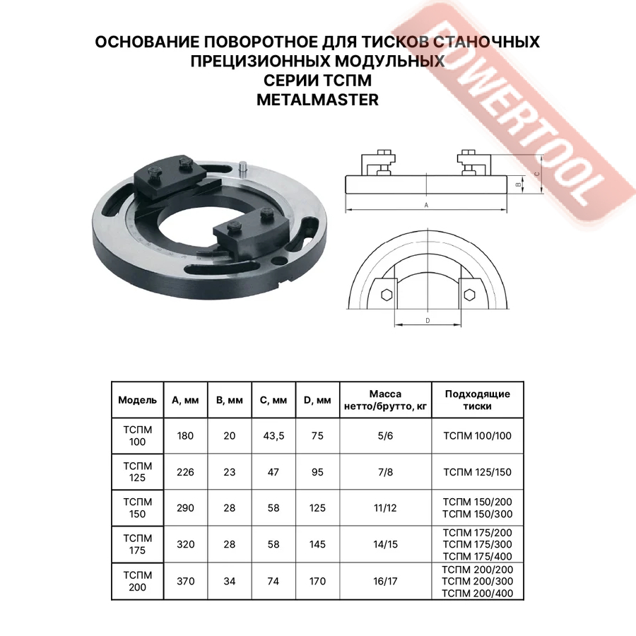 Основание поворотное для тисков, диаметр 320 мм, высота 58 мм, угол поворота 120/360 градусов, вес 14 кг. Подходит для тисков ТСПМ 175/200, ТСПМ 175/300, ТСПМ 175/400.