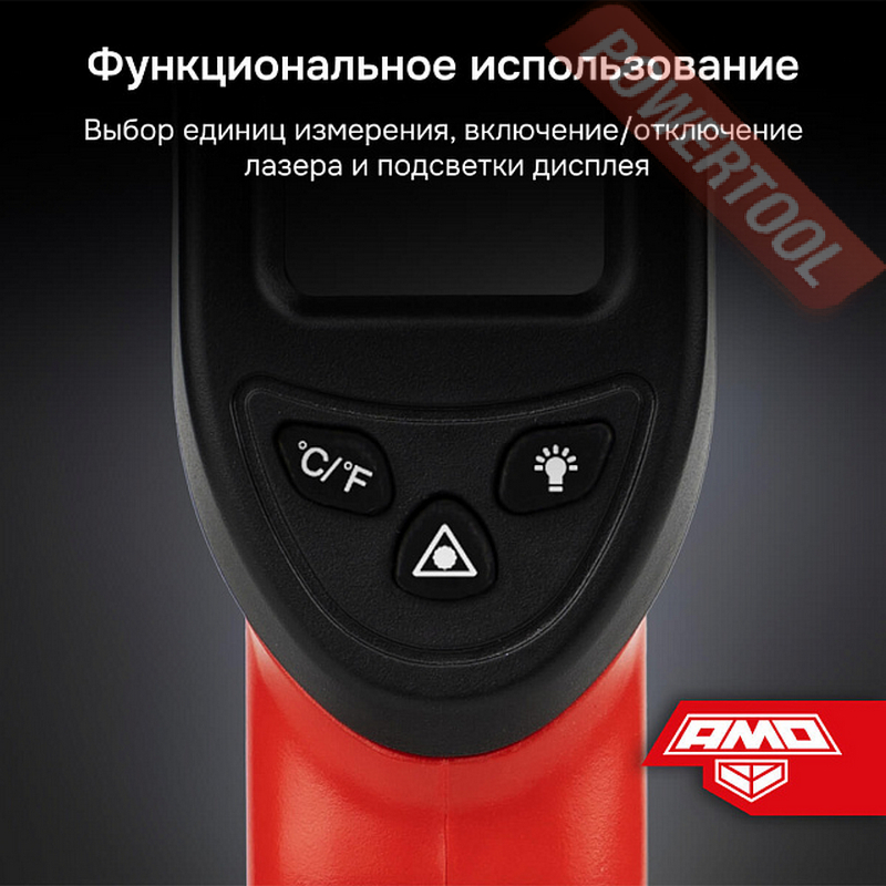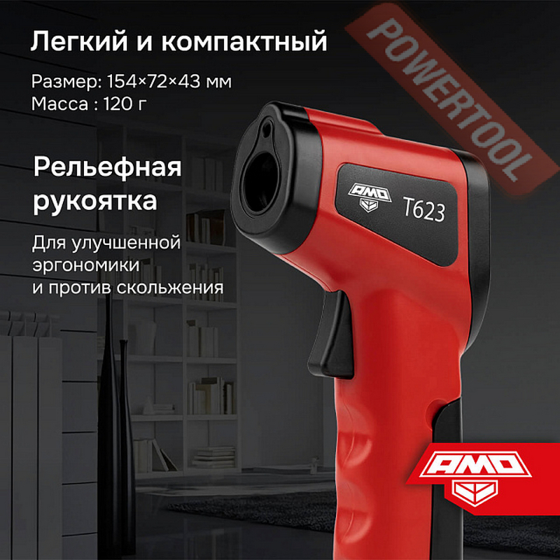 Обладая компактными размерами и небольшим весом, не превышающим 120 г, пирометр AMO T623 не обременителен при длительном использовании и легко помещается в кармане. Прибор определяет поверхностную температуру целевых объектов, используя для расчетов фиксированный показатель коэффициента излучения - 0,95, что обеспечивает достаточную точность для большинства типов материалов. Благодаря этому к выполнению замеров можно приступать сразу после включения инструмента, не тратя время на его предварительную настройку.
