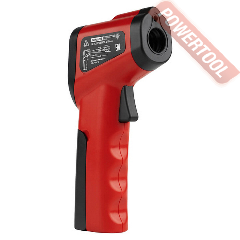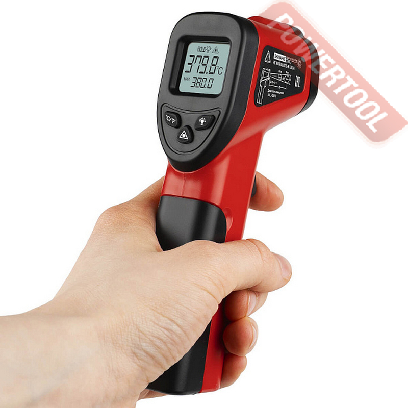 Бесконтактный инфракрасный термометр, диапазон от -50 С до 380 градусов С, точность 2 градуса С при T от -50 до 100 градусов С, 2 процента при Т от 100 до 380 градусов С, оптическое разрешение 12 к 1, фиксированный коэффициент теплового излучения 0,95, температурное разрешение 0,1 градуса С, время отклика 0,5 с, лазерный целеуказатель, сохранение измеренного значения на дисплее, спектральная чувствительность от 8 до 14 мкм, кнопка выбора единиц измерения C/F, подсветка дисплея, питание от 2 батарей ААА 1,5 В, автоотключение через 15 секунд, габариты ДхШхВ 154х72х43 мм, вес 0,12 кг, элементы питания.