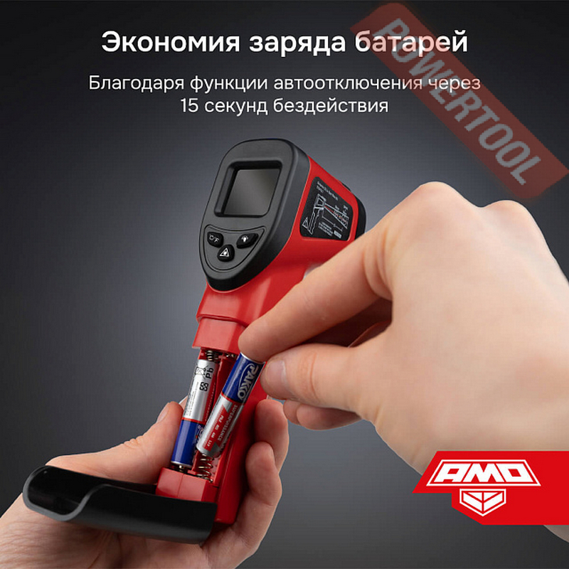 Для комфортного считывания показаний при выполнении работ в слабоосвещенных местах ЖК-дисплей пирометра снабжен подсветкой, которая включается и выключается отдельной кнопкой. В качестве источника питания в приборе используются 2 щелочные батарейки популярного типоразмера AAA. В рабочем положении они размещаются в пистолетной рукоятке под откидной крышкой и могут быть быстро заменены без использования инструментов. В случае 15-секундного бездействия в измерителе активируется функция автоотключения, которая способствует продлению ресурса батарей.