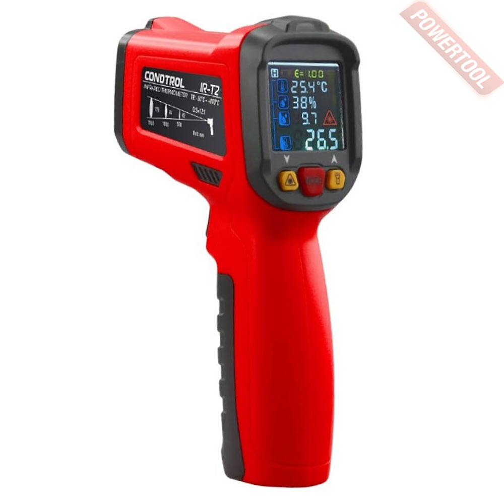 Пирометр CONDTROL IR-T2 - предназначен для измерения температуры поверхностей объектов, как бесконтактным способом, так и посредством термопары. Он оснащен датчиками температуры и влажности воздуха в помещении, инфракрасным сенсором для измерения температуры поверхности объекта, благодаря чему способен определять тепловые мосты и места возможного образования плесени. Функция ультрафиолетовой подсветки позволяет проводить диагностику систем кондиционирования.