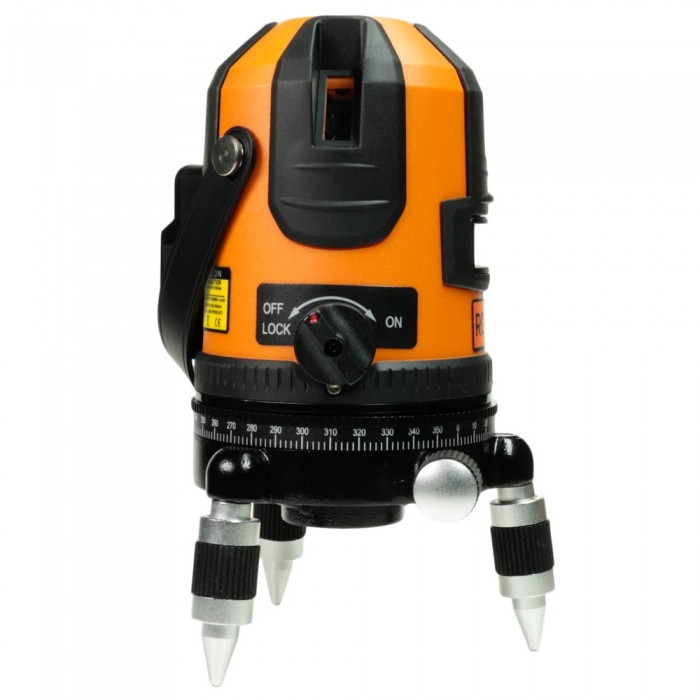 - Построение лазерных линий. Лазерный нивелир строит четыре вертикальные и одну горизонтальную плоскость с развёрткой 110 градусов. Благодаря поворотной конструкции, горизонтальному лимбу и двум точным винтам наводки лазерный уровень позволяет поворачивать лазер на 360 градусов по горизонтали, исключая необходимость перестановки прибора. Устройство может охватить все стены помещения с одной позиции.