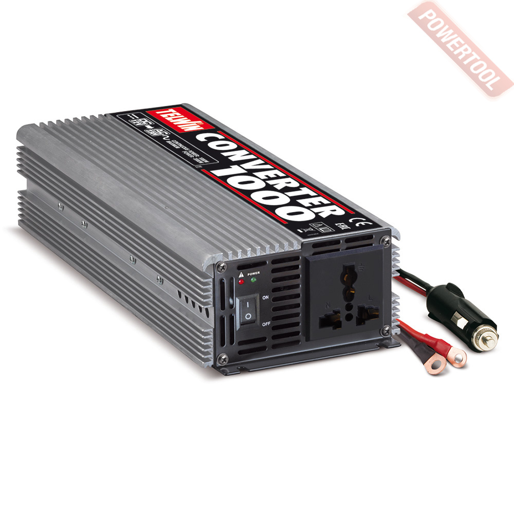 Преобразователь напряжения для автомобиля TELWIN Converter 1000, идеально подходящий для подачи питания в автомобилях и трейлерах, телевизорам, галогенным лампам, бритвам и другим электротоварам, а также, в качестве подзарядки аккумуляторов ноутбуков, электронных записных книжек, видеокамер, мобильных телефонов и т.д. Соединен посредством розетки прикуривателя и способен преобразовывать напряжение 12 В в напряжение 230 В, защищен от измененной полярности.