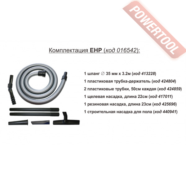 - Набор принадлежностей EHP. Оснащается при поставке набором аксессуаров для выполнения сухой и влажной уборки, а также для работы с электроинструментами.