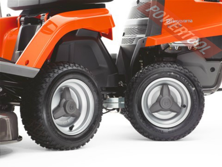 • Механическая трансмиссия с педальным управлением, т.е. переключение передач производится рычагом в ручную. Четыре больших колеса. Большие передние и задние колеса повышают комфорт и проходимость, а также снижают опасность повреждения чувствительных поверхностей. Поворотная задняя ось. Поворотная задняя ось обеспечивает максимальную тягу на приводные колеса, и как следствие, плавность движения даже на неровных поверхностях.