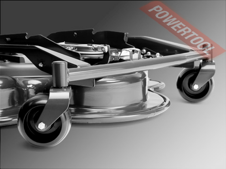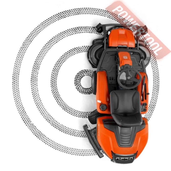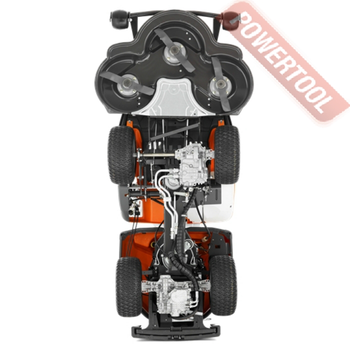 - Гидростатическая трансмиссия с педальным управлением,  т.е. как на вариаторе (газ, тормоз) без переключения скоростей! Управление скоростью и направлением движения осуществляется с помощью педалей, что позволяет оператору держать обе руки на рулевом колесе и максимально контролировать процесс управления. Система полного привода (AWD). Система полного привода (AWD) создает хорошую тягу на неровных, влажных и скользких поверхностях и склонах. AWD автоматически регулирует тягу на всех колесах с учетом ситуации и состояния земли. Четыре больших колеса. Большие передние и задние колеса повышают комфорт и проходимость, а также снижают опасность повреждения чувствительных поверхностей. Поворотная задняя ось. Поворотная задняя ось обеспечивает максимальную тягу на приводные колеса, и как следствие, плавность движения даже на неровных поверхностях. Уникальная шарнирная система рулевого управления. Уникальная шарнирная система рулевого управления обеспечивает поворот задней пары колес. Это гарантирует превосходную маневренность и минимальный радиус поворота. Удобное размещение оператора. Райдер одинаково безопасно, устойчиво и эффективно работает и на ровных участках, и на склонах. Низкое расположение центра тяжести райдера создает превосходное сцепление с поверхностью, а также обеспечивает оператору комфортное ощущение во время работы.