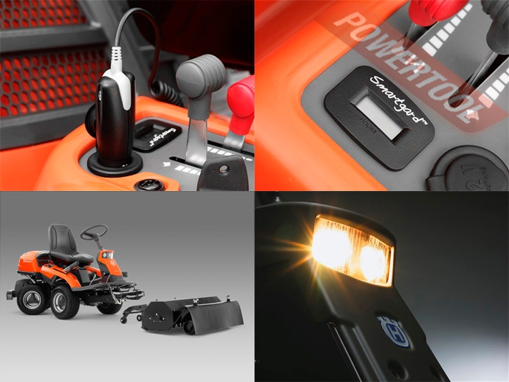 - Легкодоступные органы управления. Органы управления легкодоступны и разработаны для максимального комфорта пользователя. Легкодоступный рычаг регулировки высоты кошения. Рычагом регулировки высоты стрижки легко управлять прямо с места оператора. Поэтому Вы можете изменять высоту прямо во время кошения. Автоматическое управление ножами. Ножи автоматически приходят в движение, когда Вы опускаете режущую деку. Подстаканник. Удобный подстаканник для напитков или небольшого термоса. Передние фары. Две галогеновые фары мощностью 20 Вт создают эффективное рабочее освещение. Электрическая розетка 12В. Позволяет пользоваться дополнительным оборудованием, например, зарядным устройством мобильного телефона и т.п. Счетчик моточасов с напоминанием об обслуживании. Указывает на необходимость технического обслуживания.