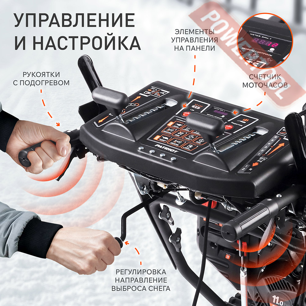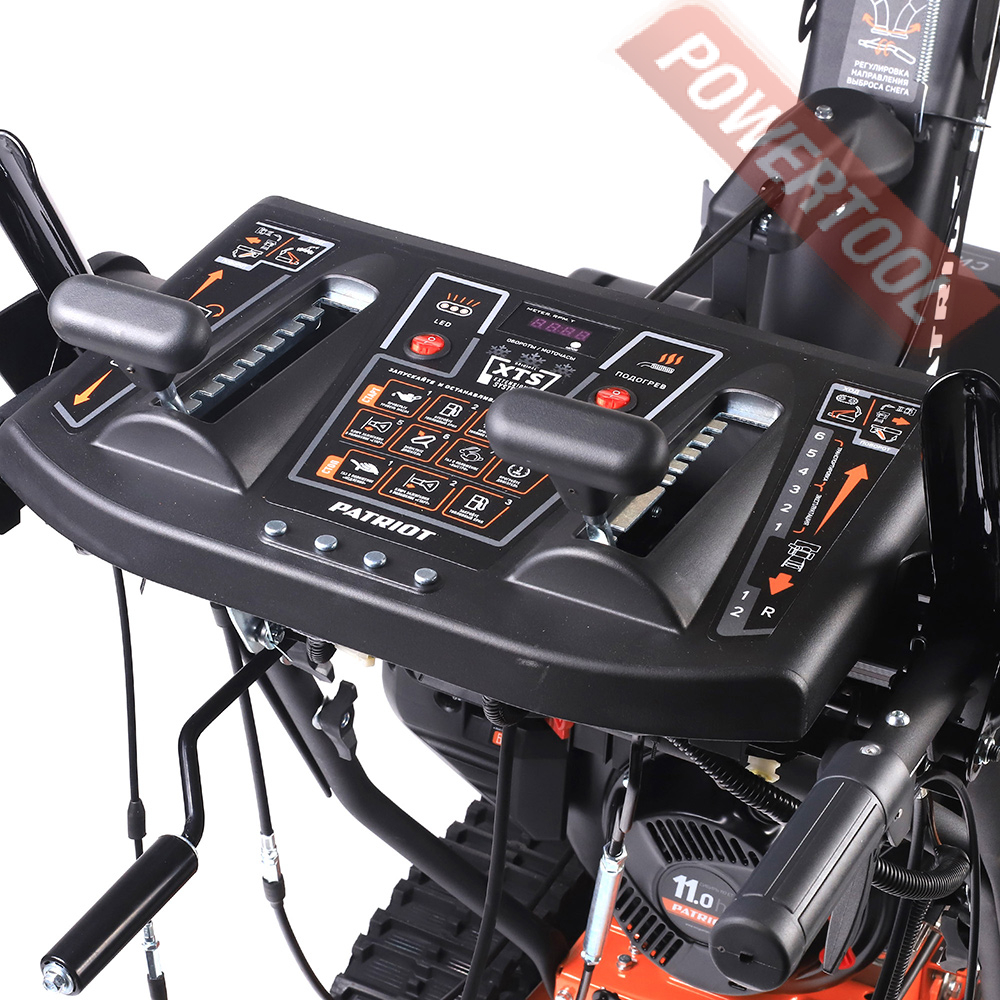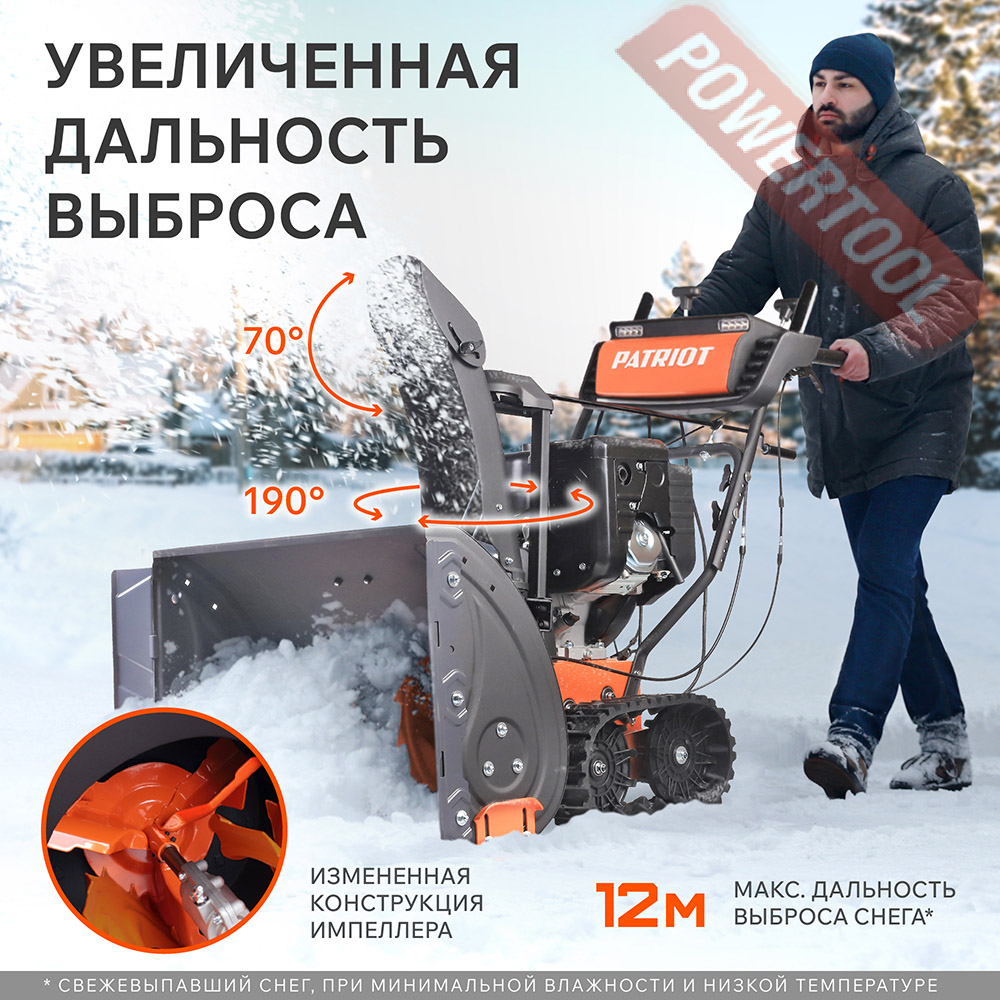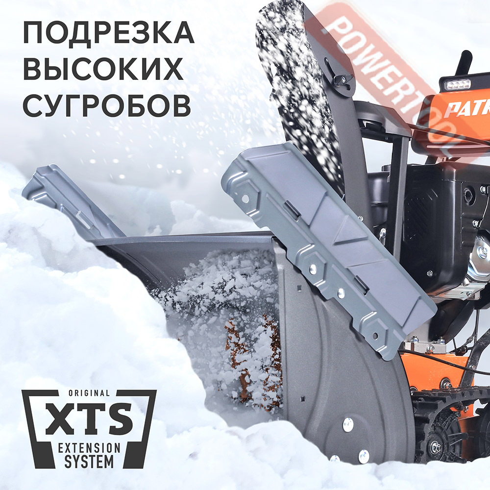 Снегоуборщик гусеничный самоходный, ширина ковша 71 см (81 см с системой XTS), высота ковша 53 см, скорости 6 вперед и 2 назад, выбор направления выброса снега осуществляется вращением боковой рукоятки, угол поворота желоба 190 градусов, дальность выброса регулируется рукояткой с панели оператора и достгиает до 12 м, разблокировка гусениц двумя курками под каждой рукояткой, система XTS, подогрев рукояток, LED фара, гусеницы, 4-тактный бензиновый двигатель PATRIOT объемом 302 куб.см и мощностью 11 л.с., топливный бак 4,5 л, емкость картера 0,95 л, трансмиссия фрикционный диск, размеры упаковки 1185х710х850 мм, вес 127 кг.