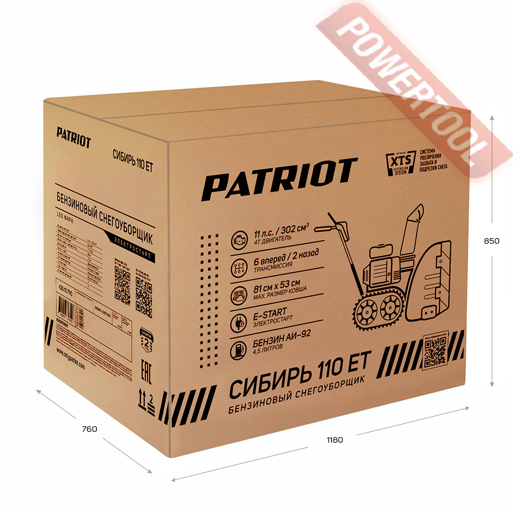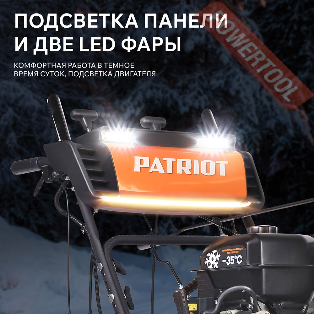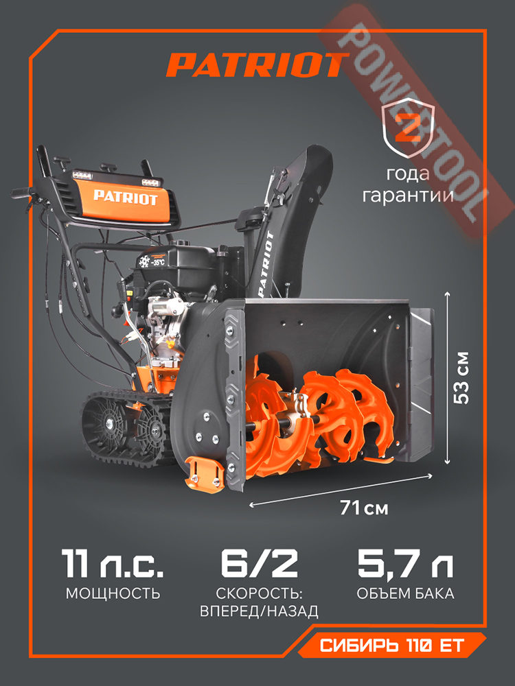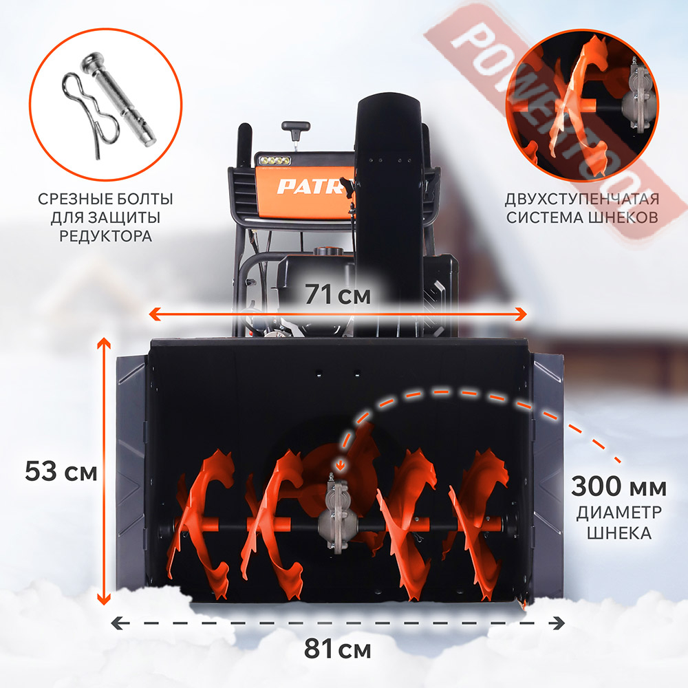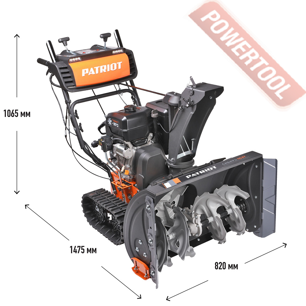 Снегоуборщик гусеничный самоходный, ширина ковша 71 см (81 см с системой XTS), высота ковша 53 см, скорости 6 вперед и 2 назад, выбор направления выброса снега осуществляется вращением боковой рукоятки, угол поворота желоба 190 градусов, дальность выброса регулируется рукояткой с панели оператора и достгиает до 12 м, разблокировка гусениц двумя курками под каждой рукояткой, система XTS, подогрев рукояток, LED фара, гусеницы, 4-тактный бензиновый двигатель PATRIOT объемом 302 куб.см и мощностью 11 л.с., топливный бак 4,5 л, емкость картера 0,95 л, трансмиссия фрикционный диск, размеры упаковки 1185х710х850 мм, вес 127 кг.