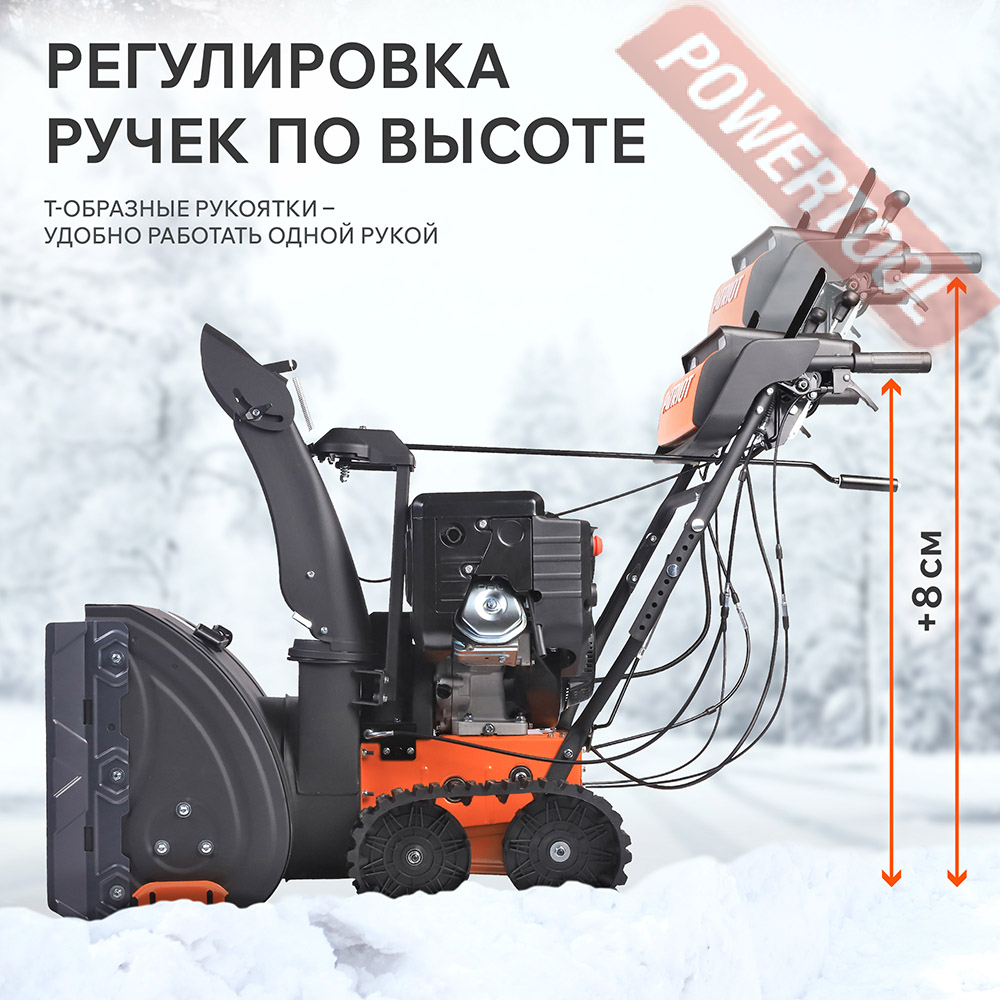 • Управление одной рукой. Возможность управления одной рукой позволяет отрегулировать дальность выброса, не останавливая снегоуборщик.